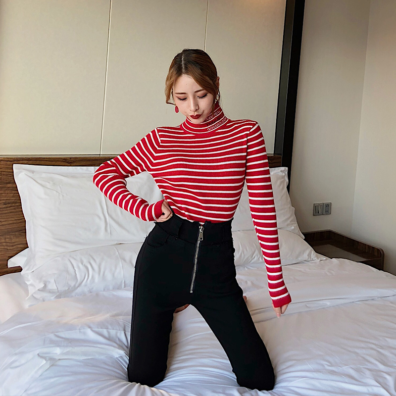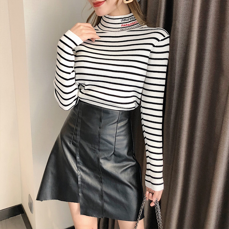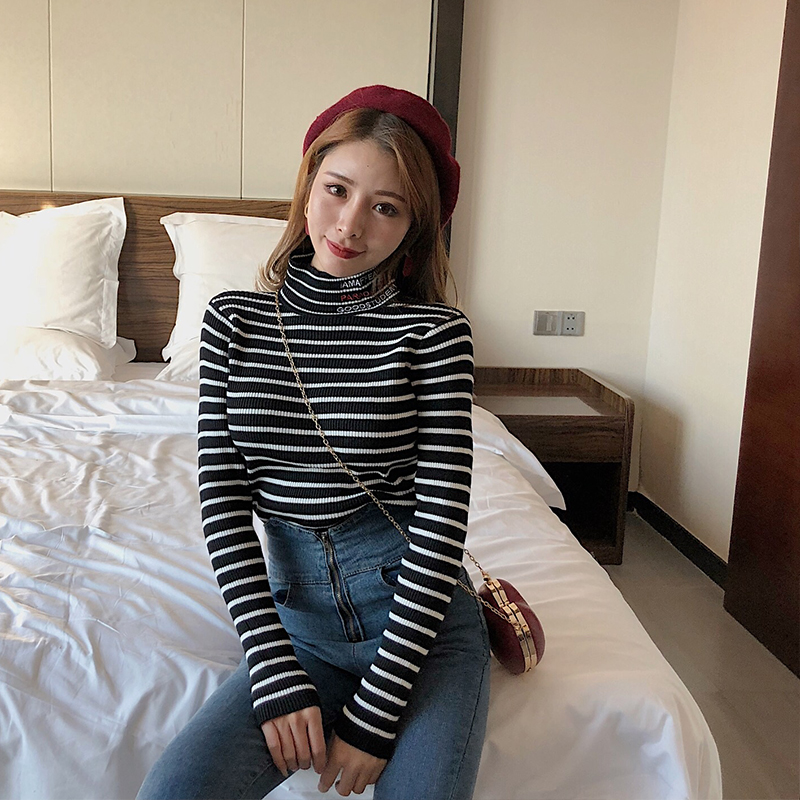 上衣女2018秋冬新款韓版修身顯瘦高領條紋長袖chic百搭針織打底衫