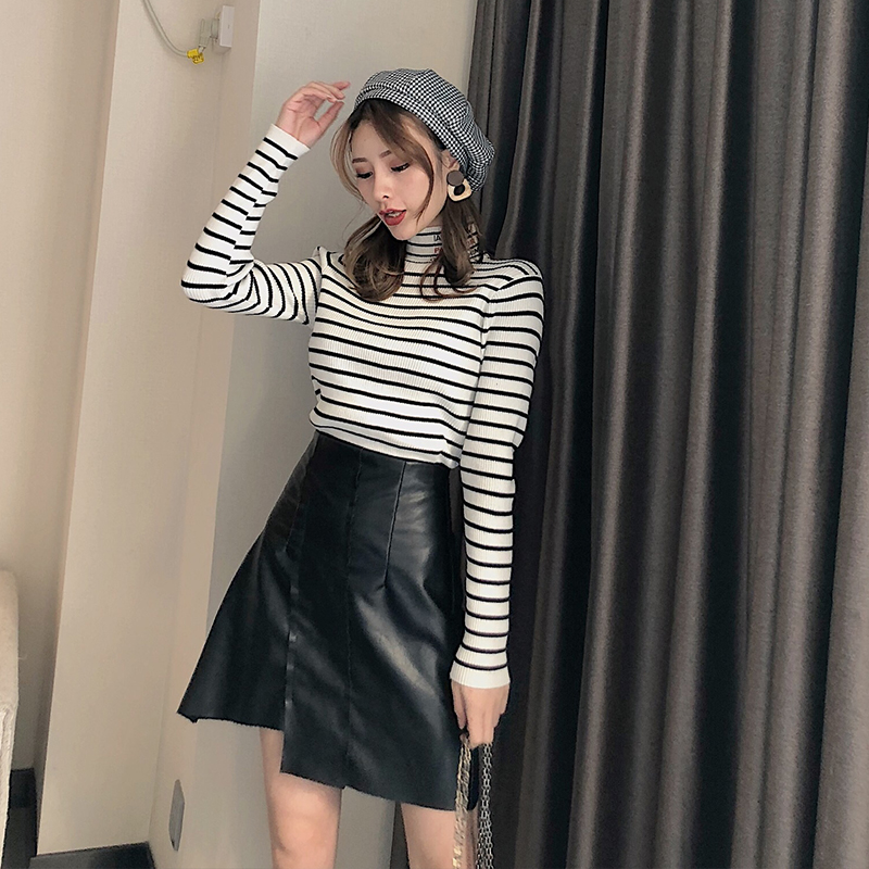 / 上衣女2018秋冬新款韓版修身顯瘦高領條紋長袖chic百搭針織打底衫