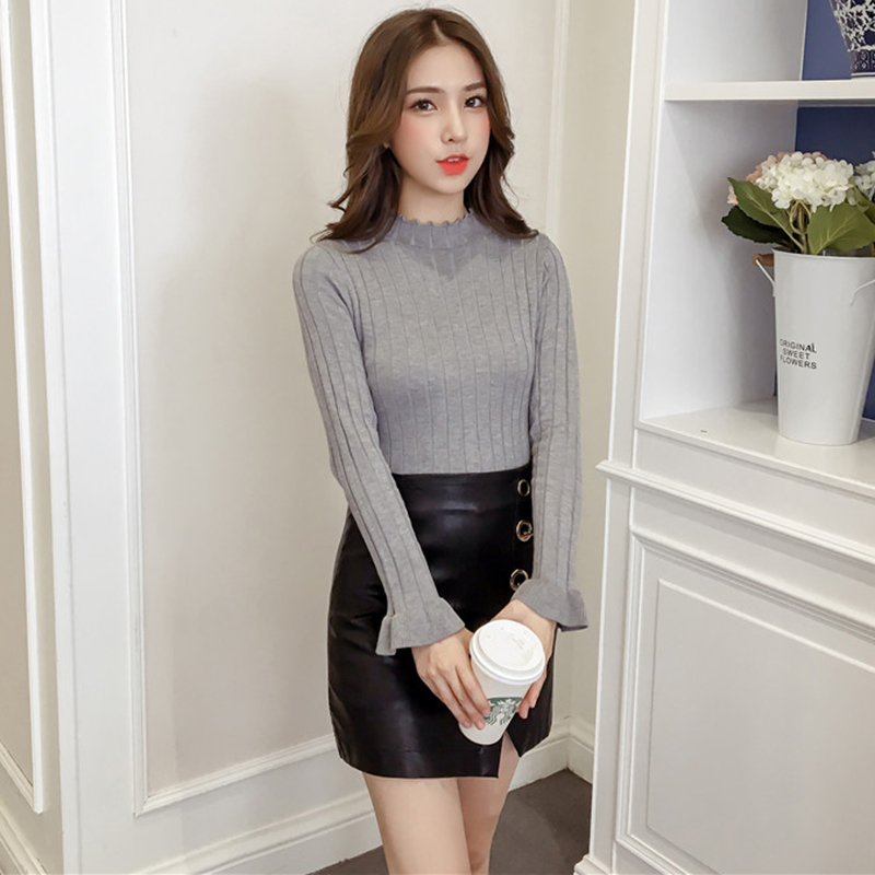 / 韓版秋裝新款修身喇叭長袖打底衫女學生波浪邊半高領針織毛衣上衣