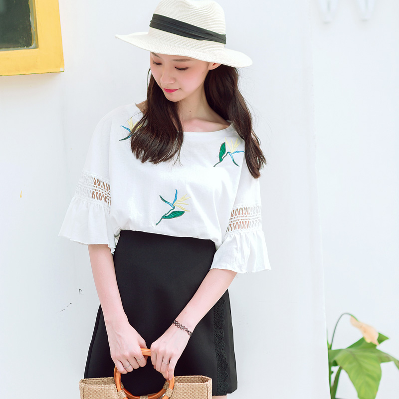 / 短袖襯衫女夏裝新款韓版時尚百搭學生刺繡喇叭袖寬松襯衫上衣