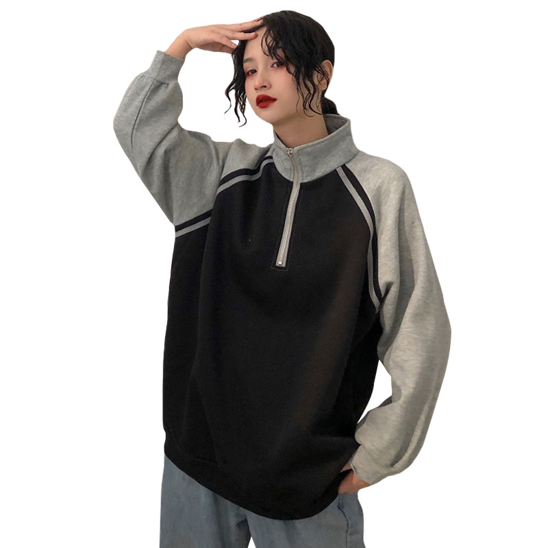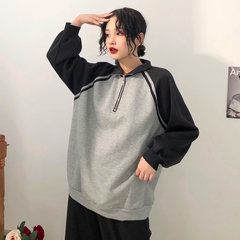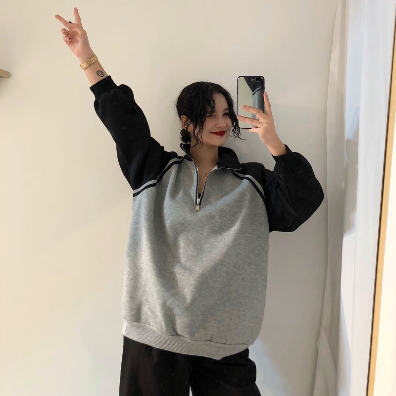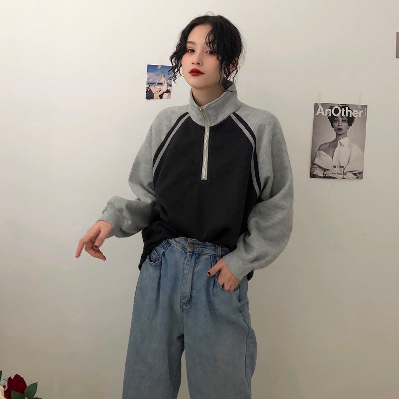 / 秋冬韓版寬松原宿風拼色立領拉鏈加絨加厚套頭超火衛衣上衣外套女