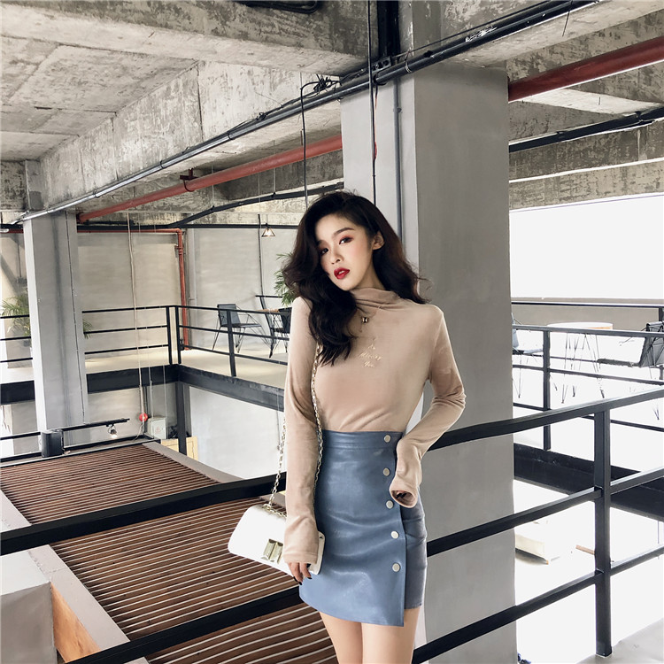 初秋新款女上衣韓版時尚chic基礎款百搭顯瘦高領純色打底衫t恤女