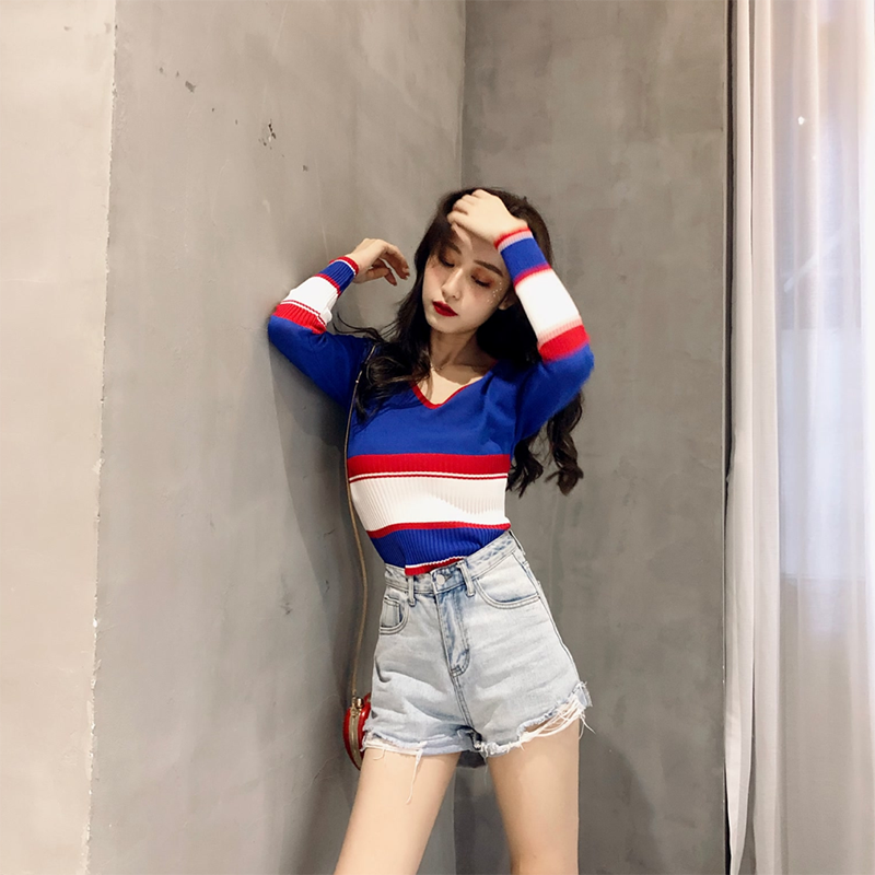 / 復古韓國chic風修身顯瘦條紋撞色V領長袖打底衫韓版學生針織衫女