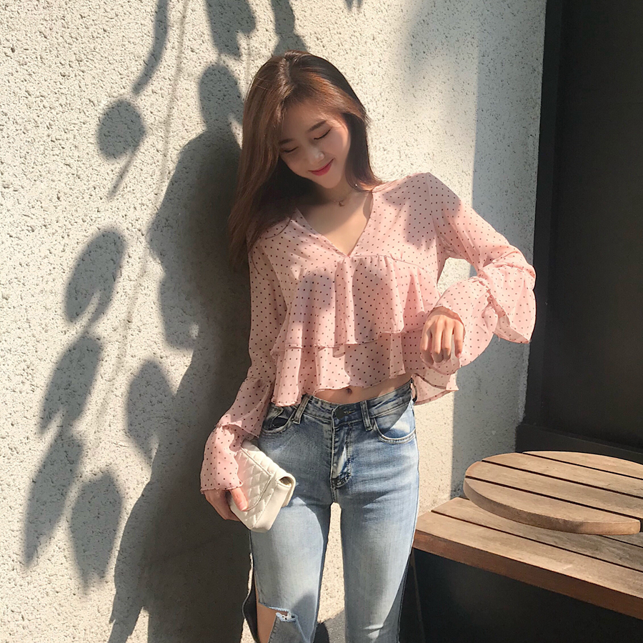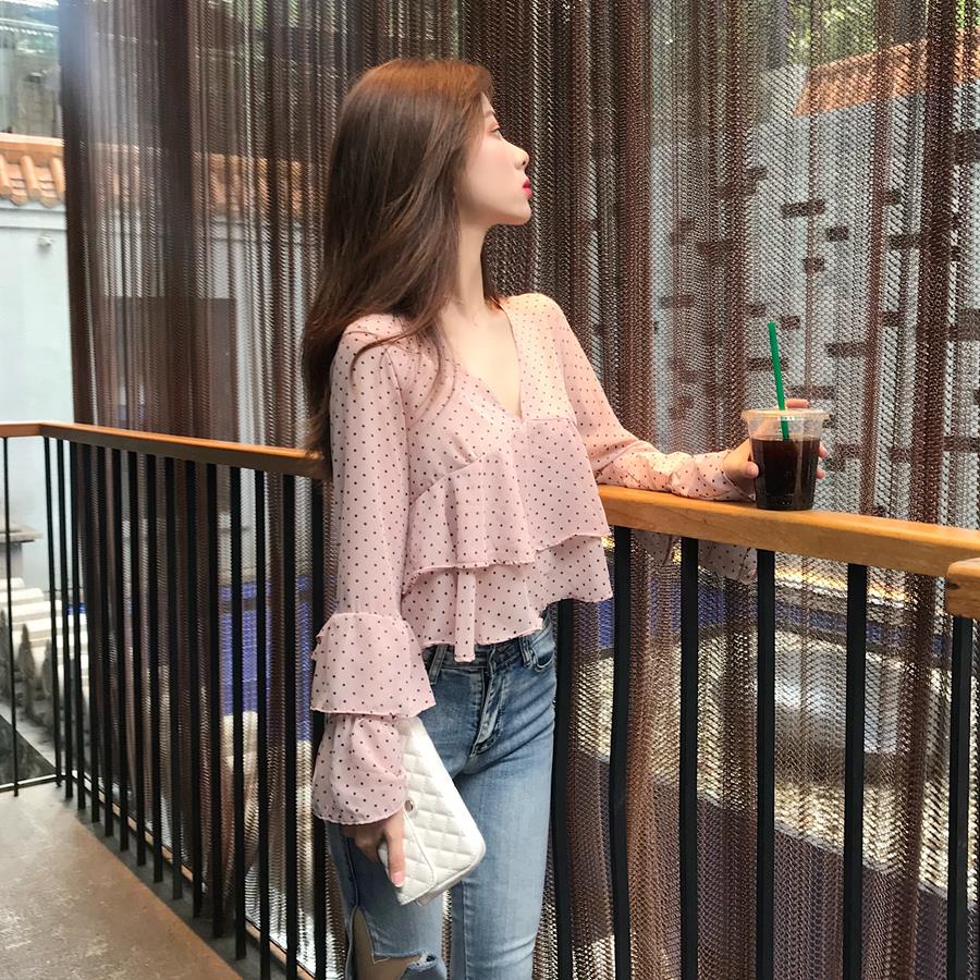 / 甜美短款時尚溫柔風chic波點荷葉邊喇叭袖雪紡衫V領寬松百搭上衣