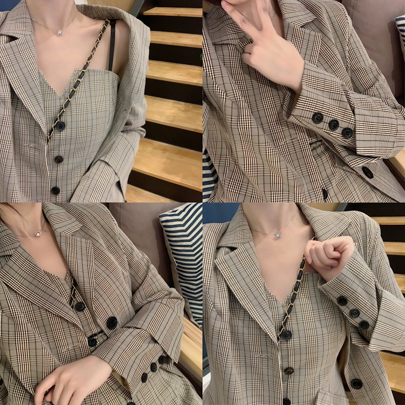 名媛氣質潮流時尚套裝韓版格子西服外套百搭v領吊帶連衣裙兩件套