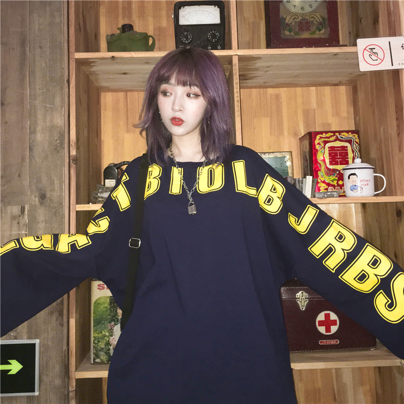 / 時尚抽繩字母印花T恤女秋冬裝新款學生寬松長袖上衣外穿套頭體恤
