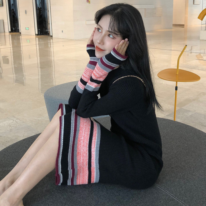chic風裙子女秋冬裝2018新款韓版氣質修身拼色套頭針織長袖連衣裙
