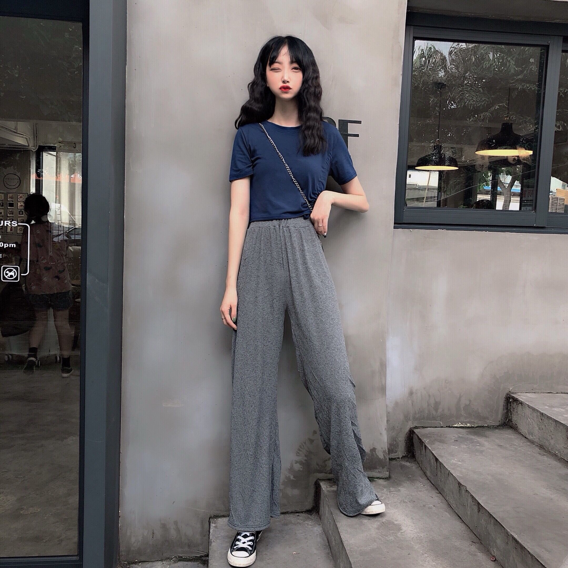 馨幫幫 韓國ulzzang休閑套裝女高腰垂感闊腿長褲+ins抽繩短款上衣