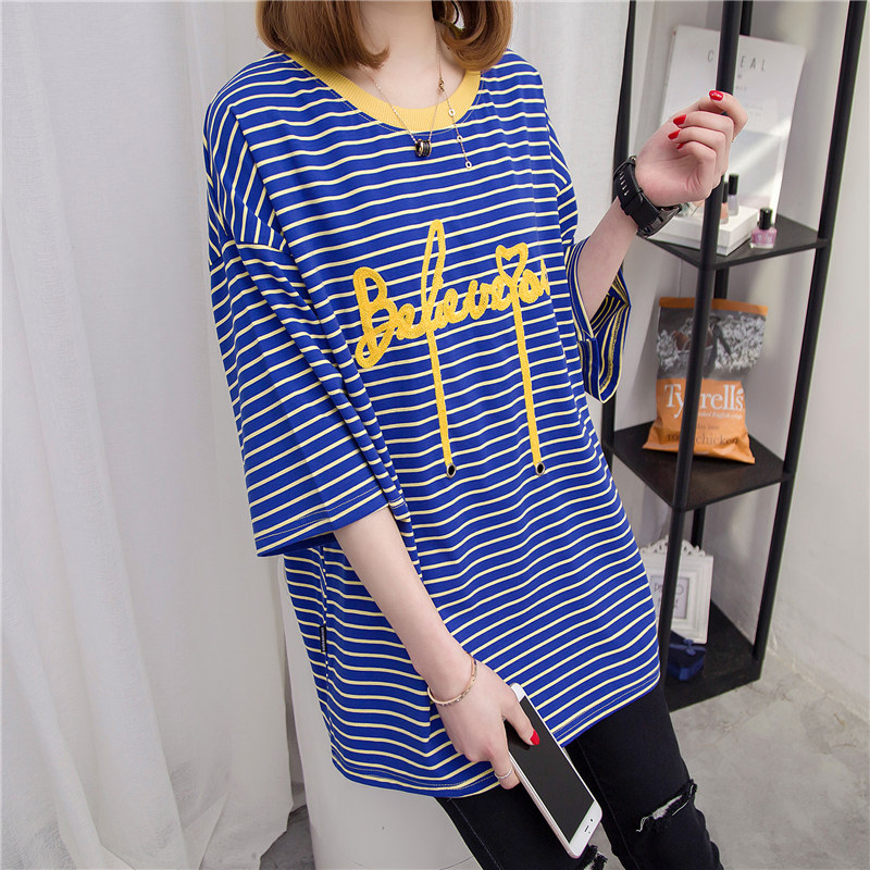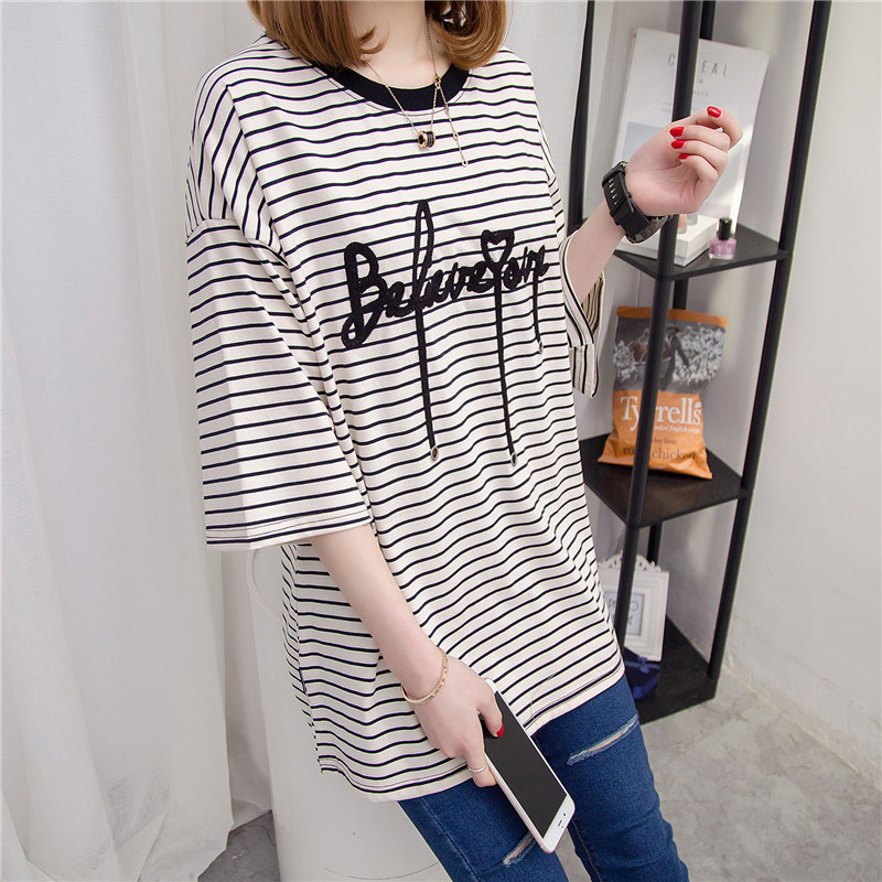 / 條紋短袖上衣女夏新款潮體恤打底韓版寬松t恤中長袖百搭春裝
