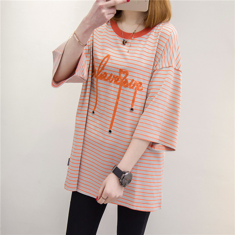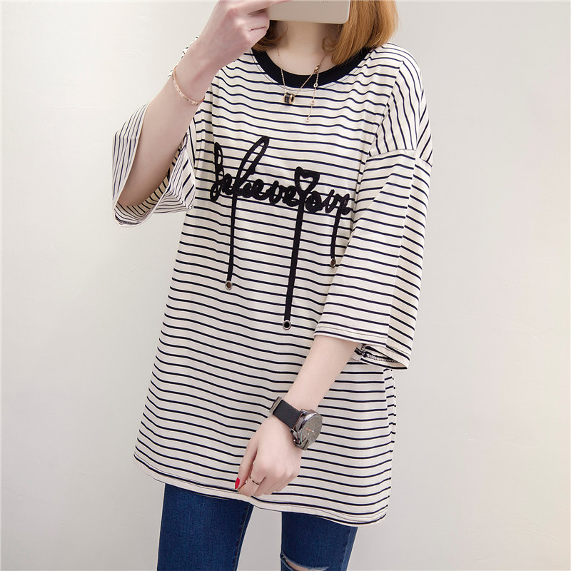 條紋短袖上衣女夏新款潮體恤打底韓版寬松t恤中長袖百搭春裝