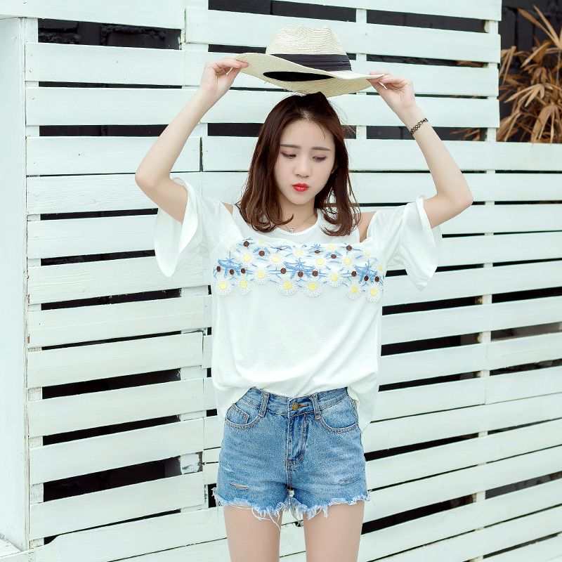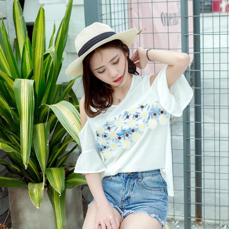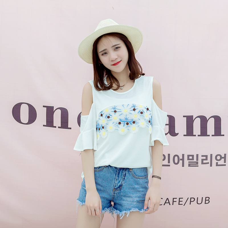 春夏裝韓版女裝新款學生寬松露肩上衣刺繡荷葉邊短袖雪紡衫潮
