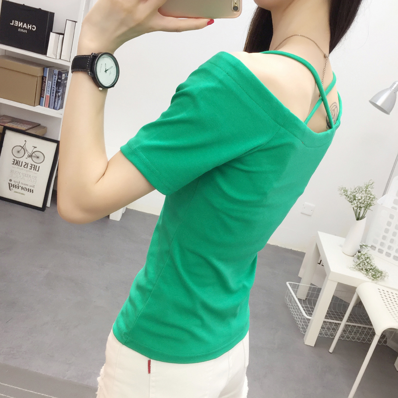 夏裝韓版漏肩純色v領t恤女短袖打底衫心機半袖體恤短款上衣潮