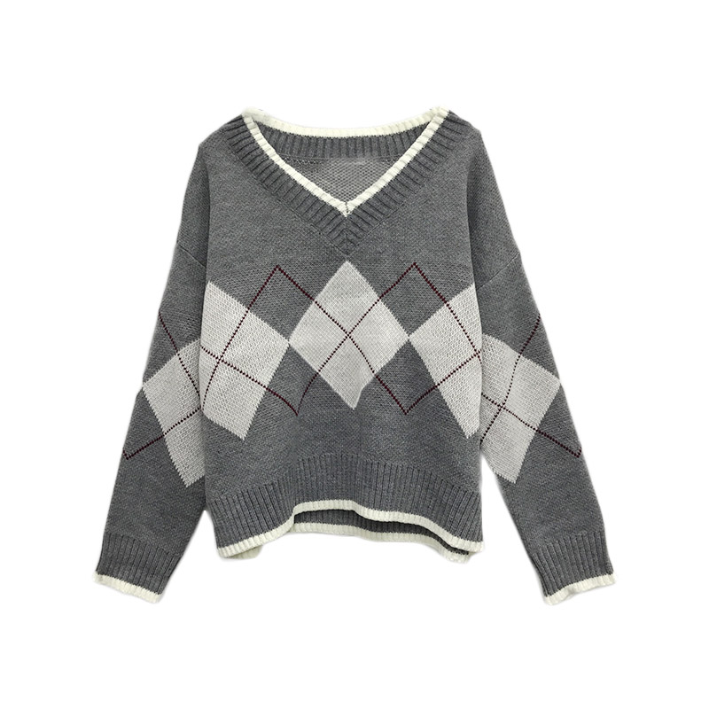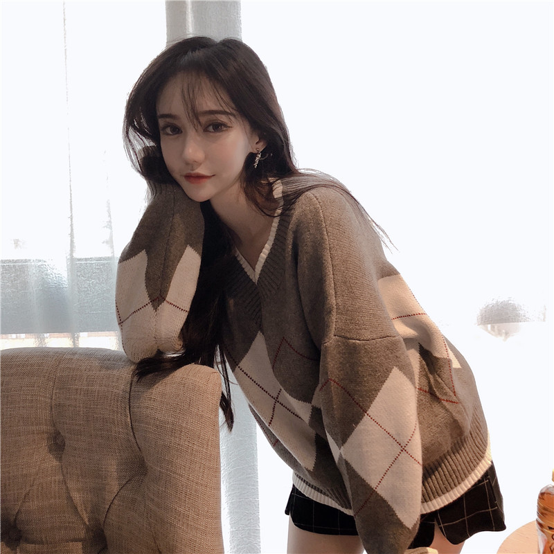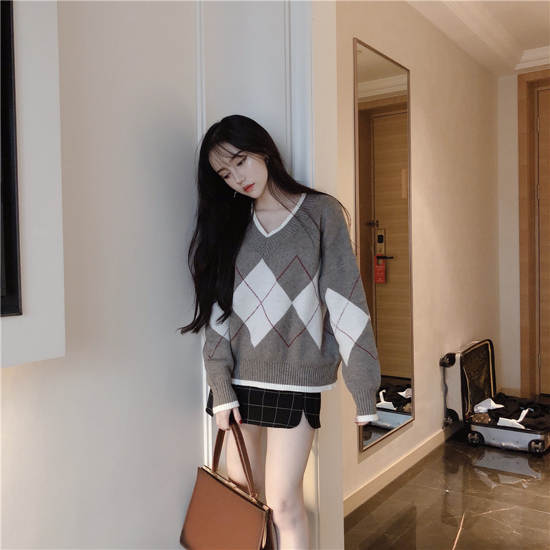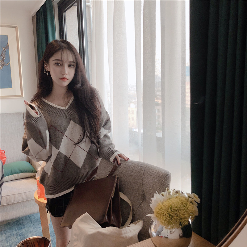 韓國chic網紅毛衣女2018新款大V領慵懶加厚寬松菱格配色套頭上衣