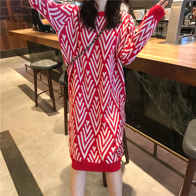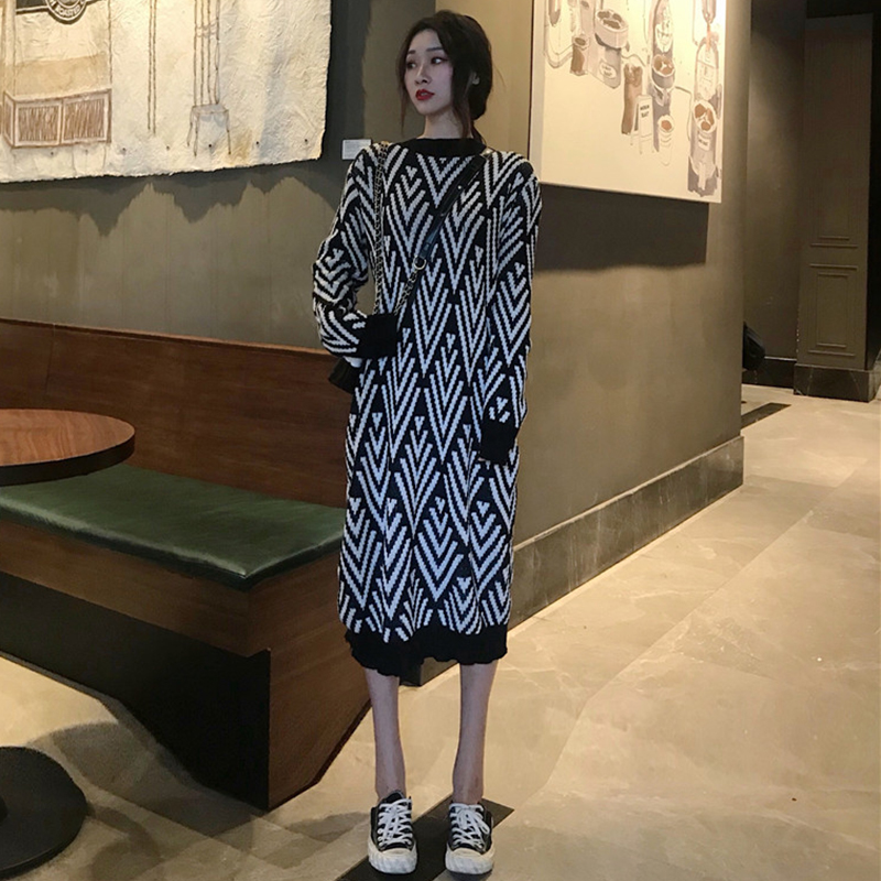 chic中長款撞色毛衣裙女秋冬裝2018新款韓版寬松套頭長袖連衣裙子
