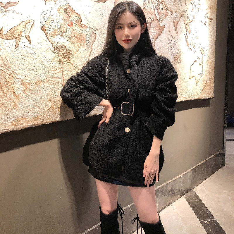 復古黑色羊羔毛外套秋冬女裝2018新款港風寬松開衫收腰顯瘦上衣潮
