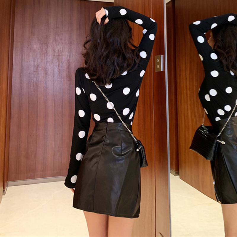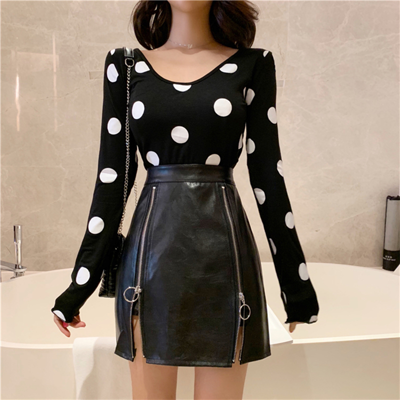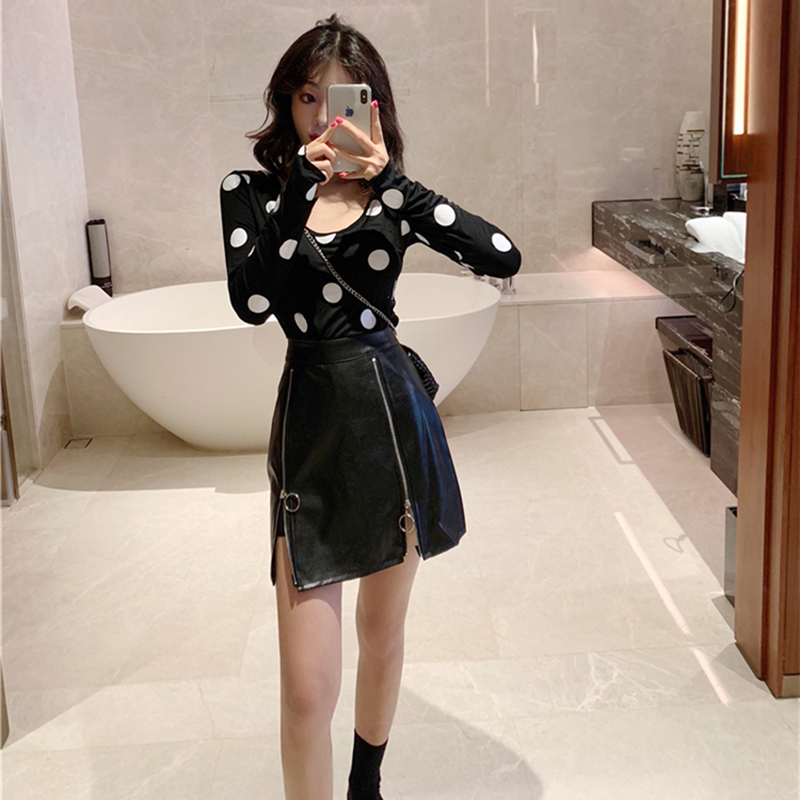 秋裝女2018新款時尚波點長袖T恤氣質高腰pu皮包臀半身裙子兩件套