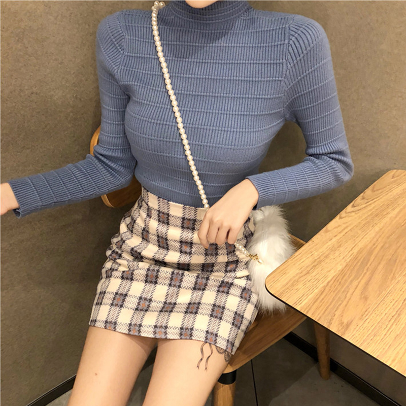 兩件套裝女秋冬新款小高領修身長袖針織打底衫高腰顯瘦格子半身裙