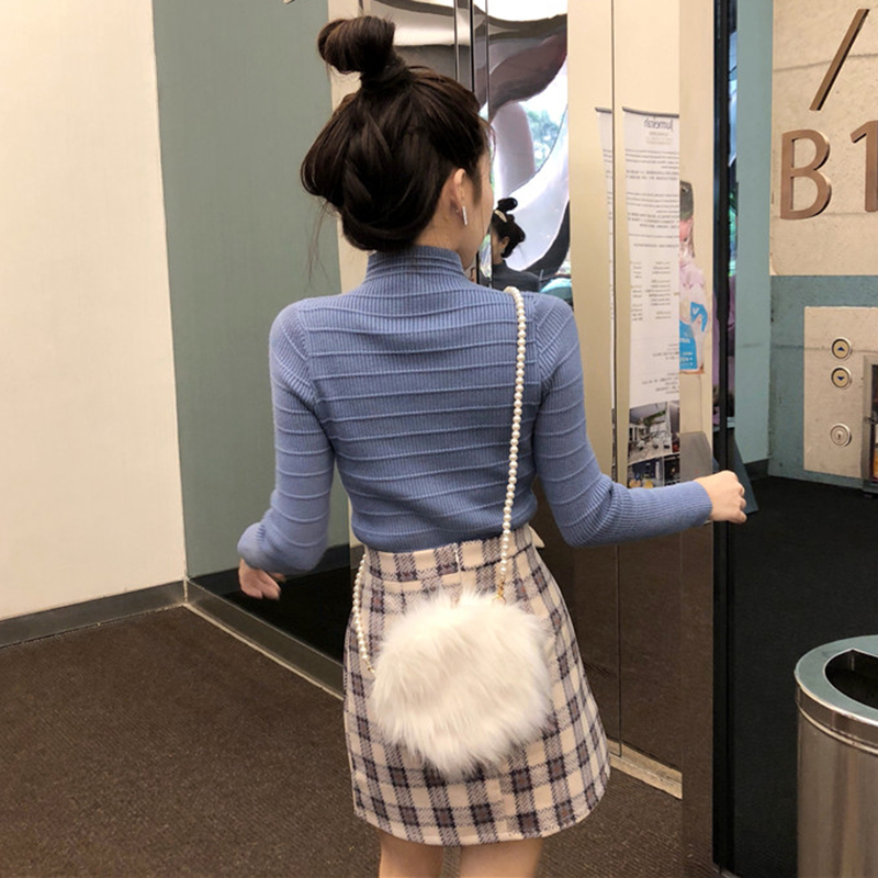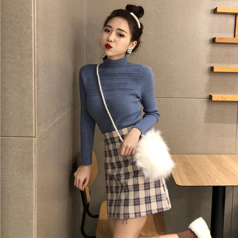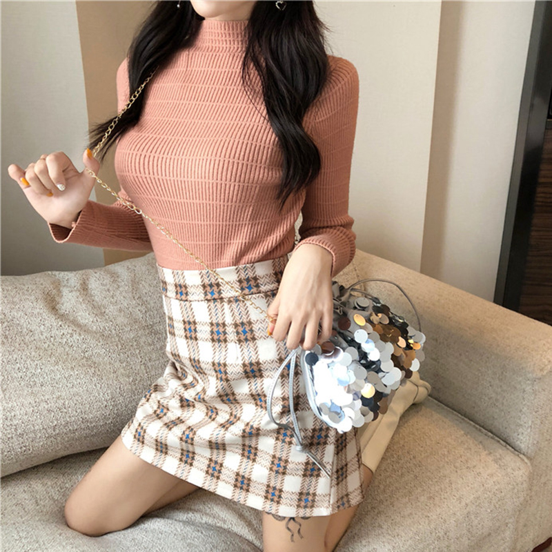 / 兩件套裝女秋冬新款小高領修身長袖針織打底衫高腰顯瘦格子半身裙
