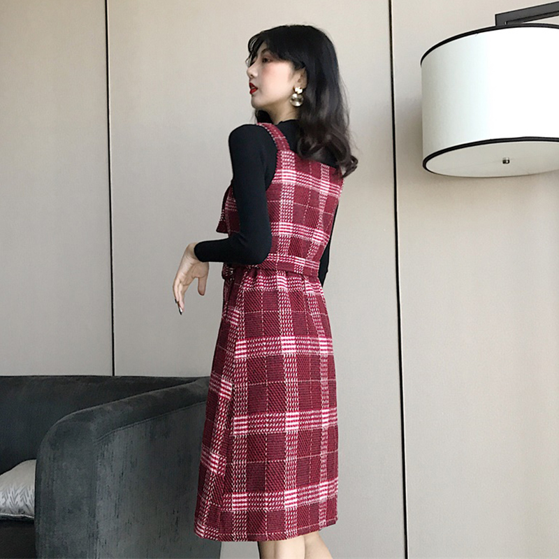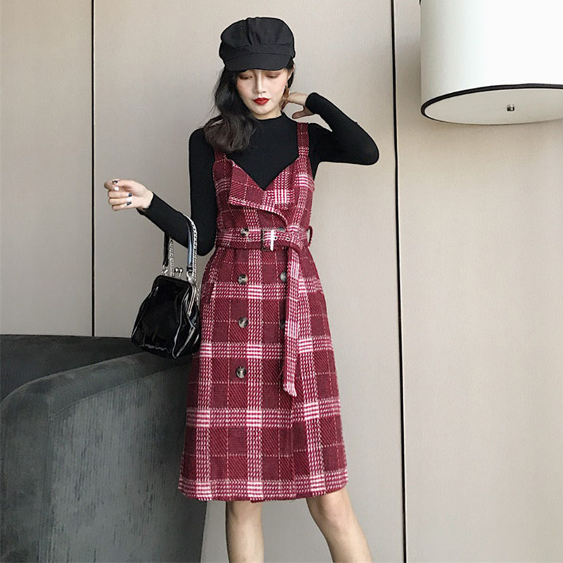 / 套裝女秋季新款修身長袖打底衫上衣復古紅色格子收腰背帶連衣裙子