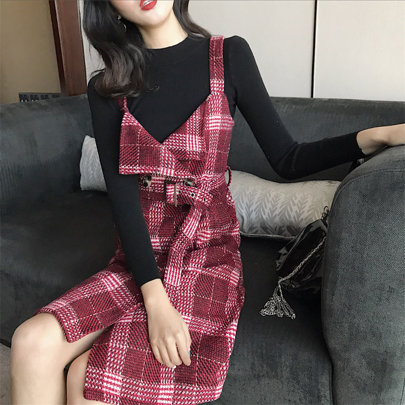 套裝女秋季新款修身長袖打底衫上衣復古紅色格子收腰背帶連衣裙子