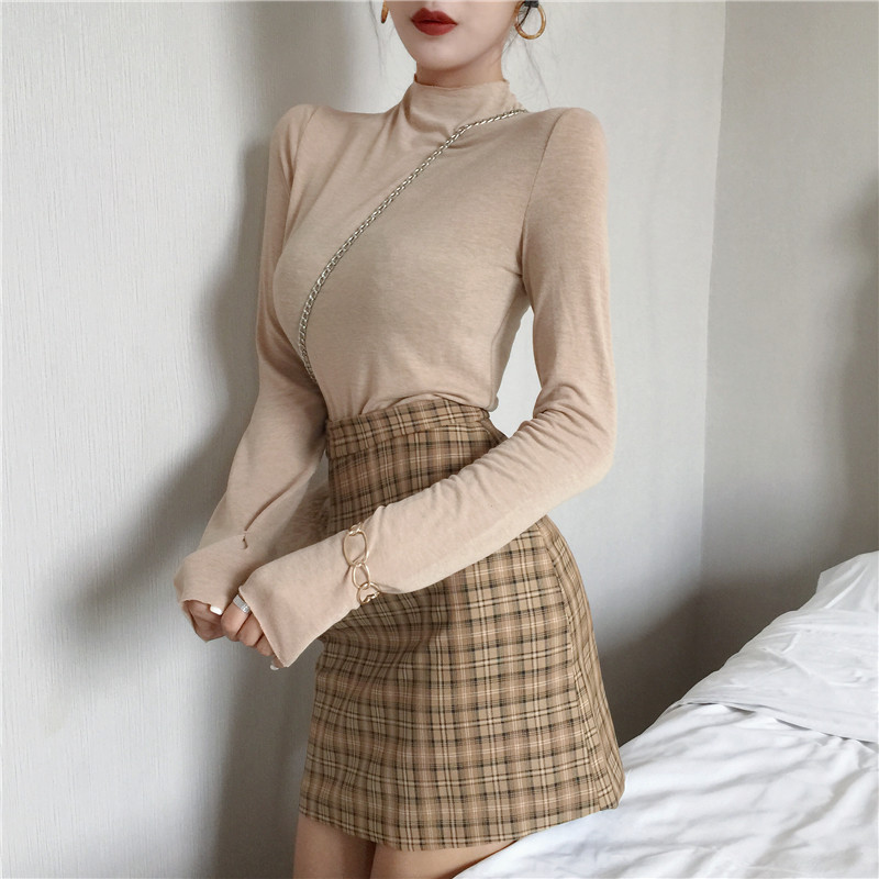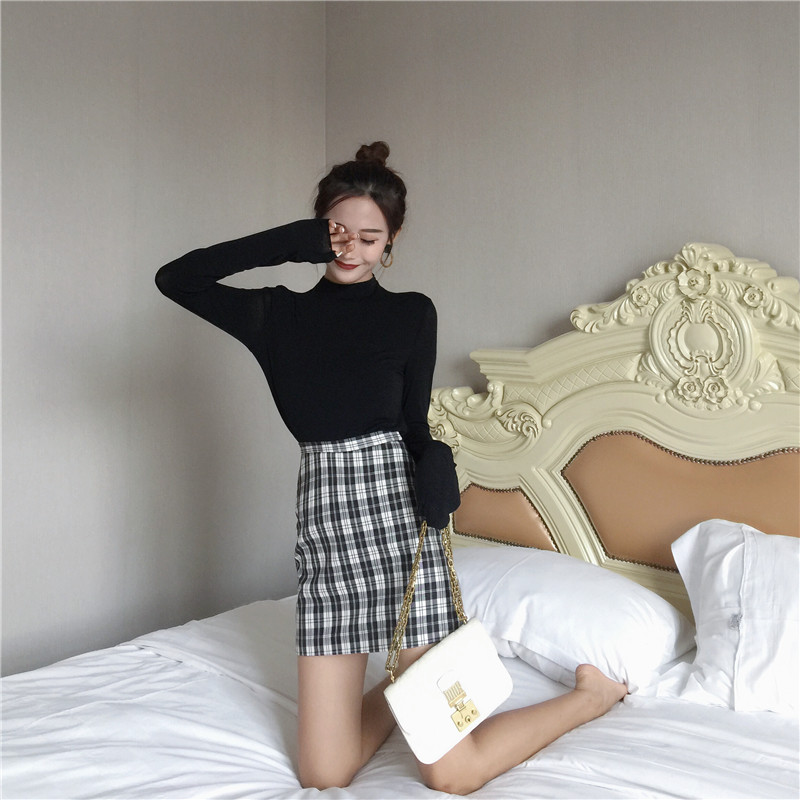 2018秋裝新款韓版復古簡約基礎立領顯瘦T恤高腰格子半身A字裙套裝