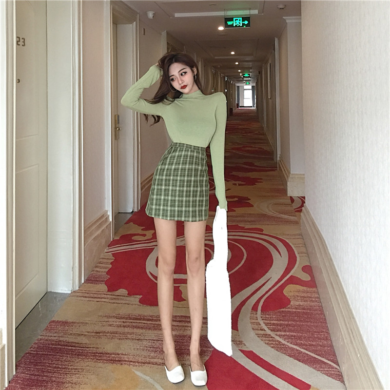 / 2018秋裝新款韓版復古簡約基礎立領顯瘦T恤高腰格子半身A字裙套裝