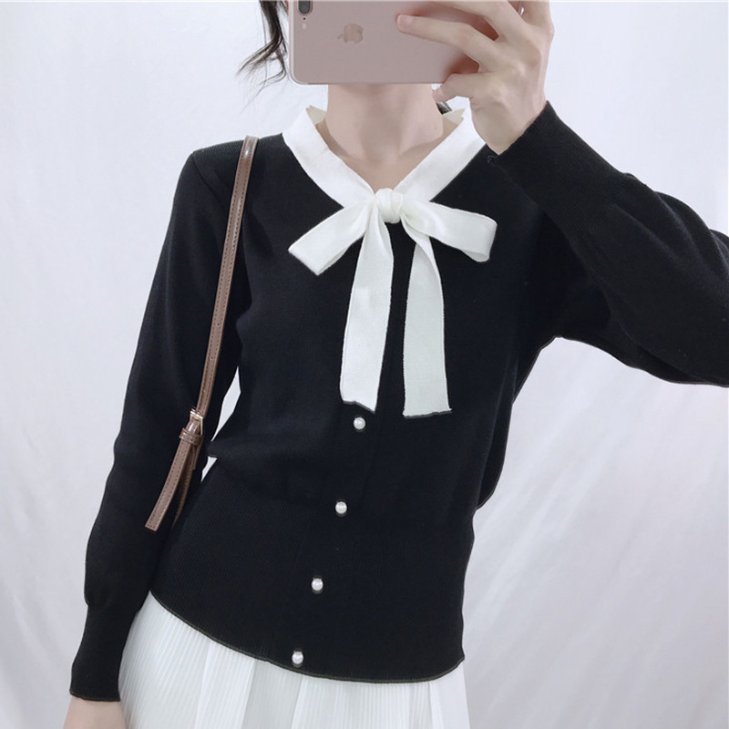 / 時尚撞色蝴蝶結針織開衫秋裝女2018新款韓版chic氣質修身長袖上衣