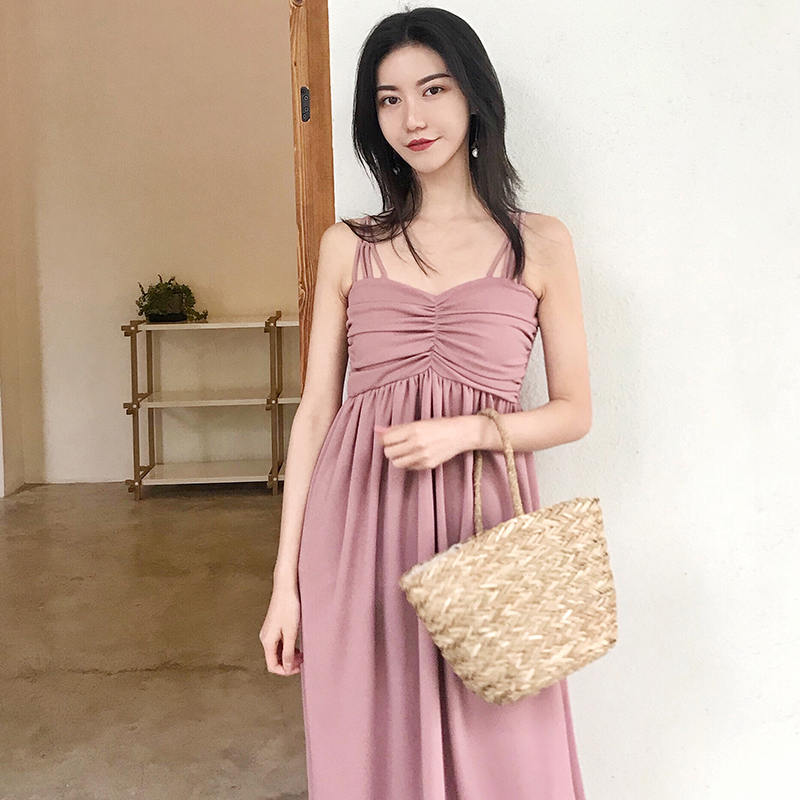 / 夏季新款女裝多肩帶收腰顯瘦抽褶抹胸純裙子色學生吊帶連衣裙長裙