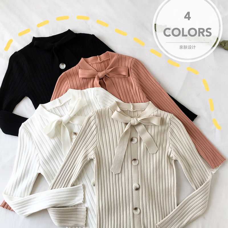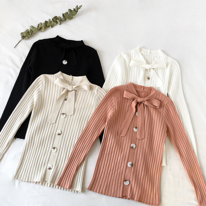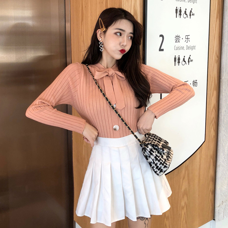 系帶蝴蝶結長袖針織衫冬裝2018新款chic氣質修身套頭打底薄毛衣女