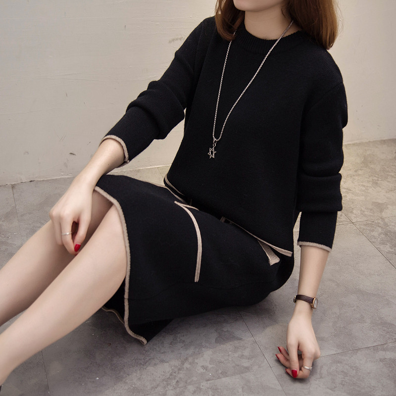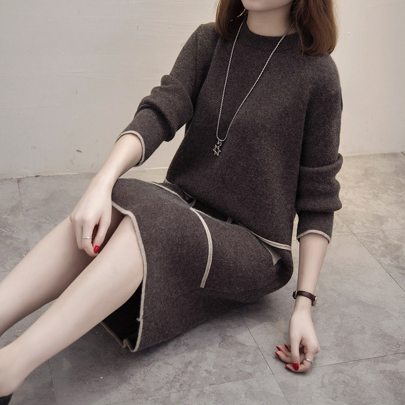 / 圓領套頭毛衣女秋冬季針織衫寬松口袋打底衫加厚中長款毛衣裙外套