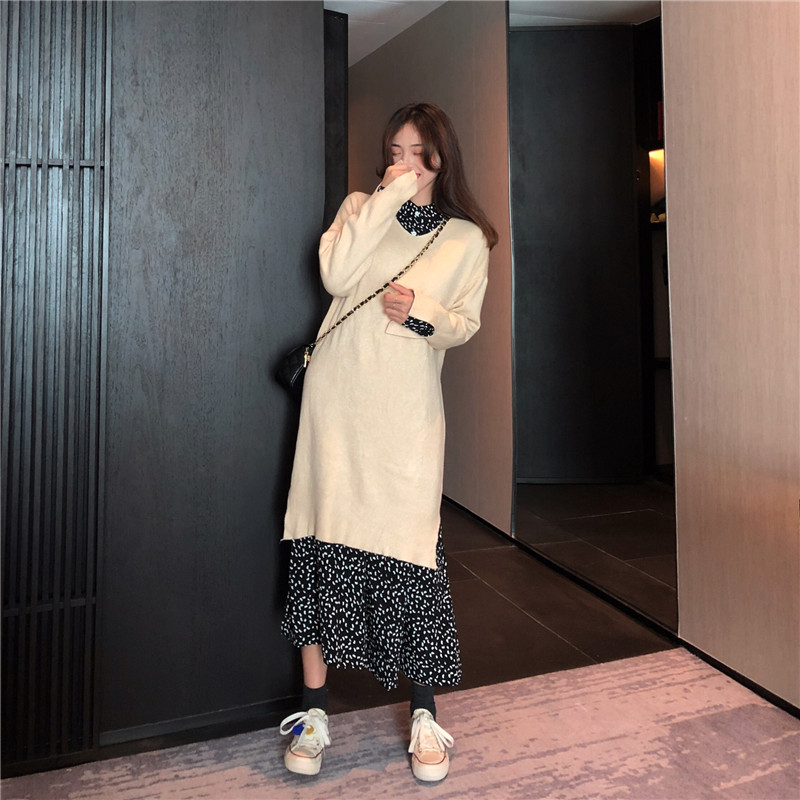秋冬韓版新款中長款毛絨針織馬甲+氣質系帶雪紡連衣裙時尚兩件套