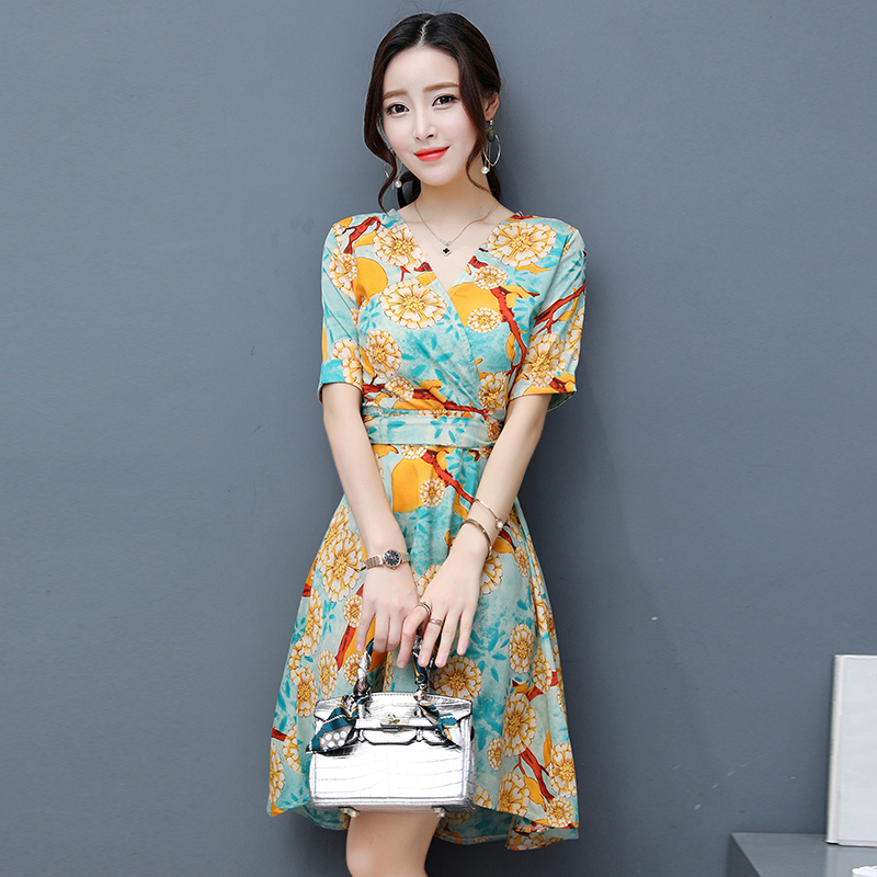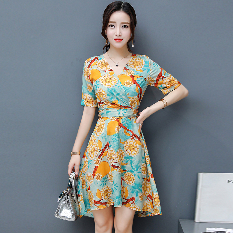 夏季新款女裝韓版氣質短袖修身裙子中長款印花雪紡連衣裙女潮