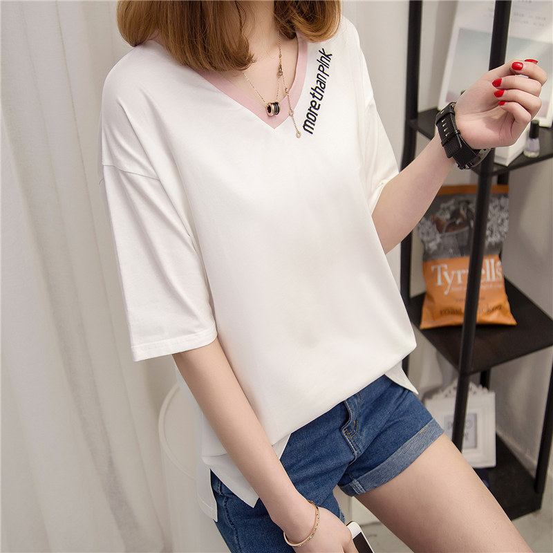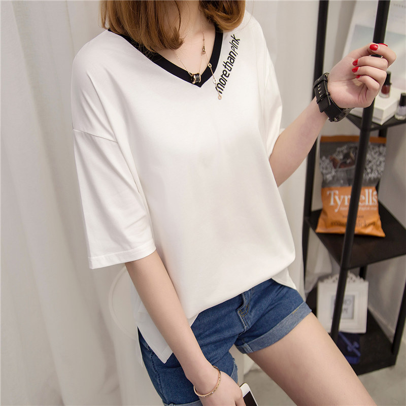女裝V領t恤韓版寬松打底衫純色百搭上衣女夏季新款上衣女t恤