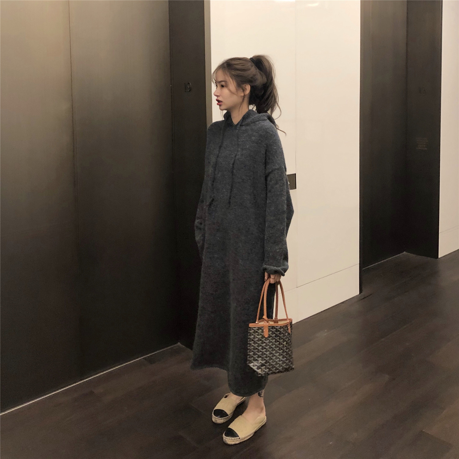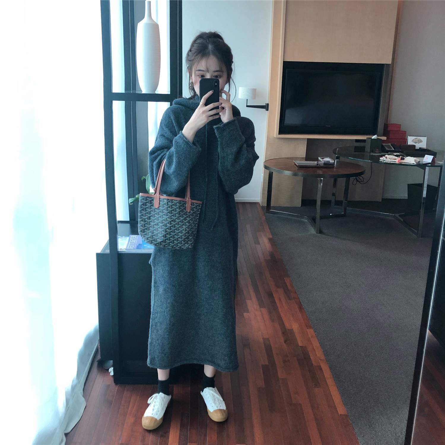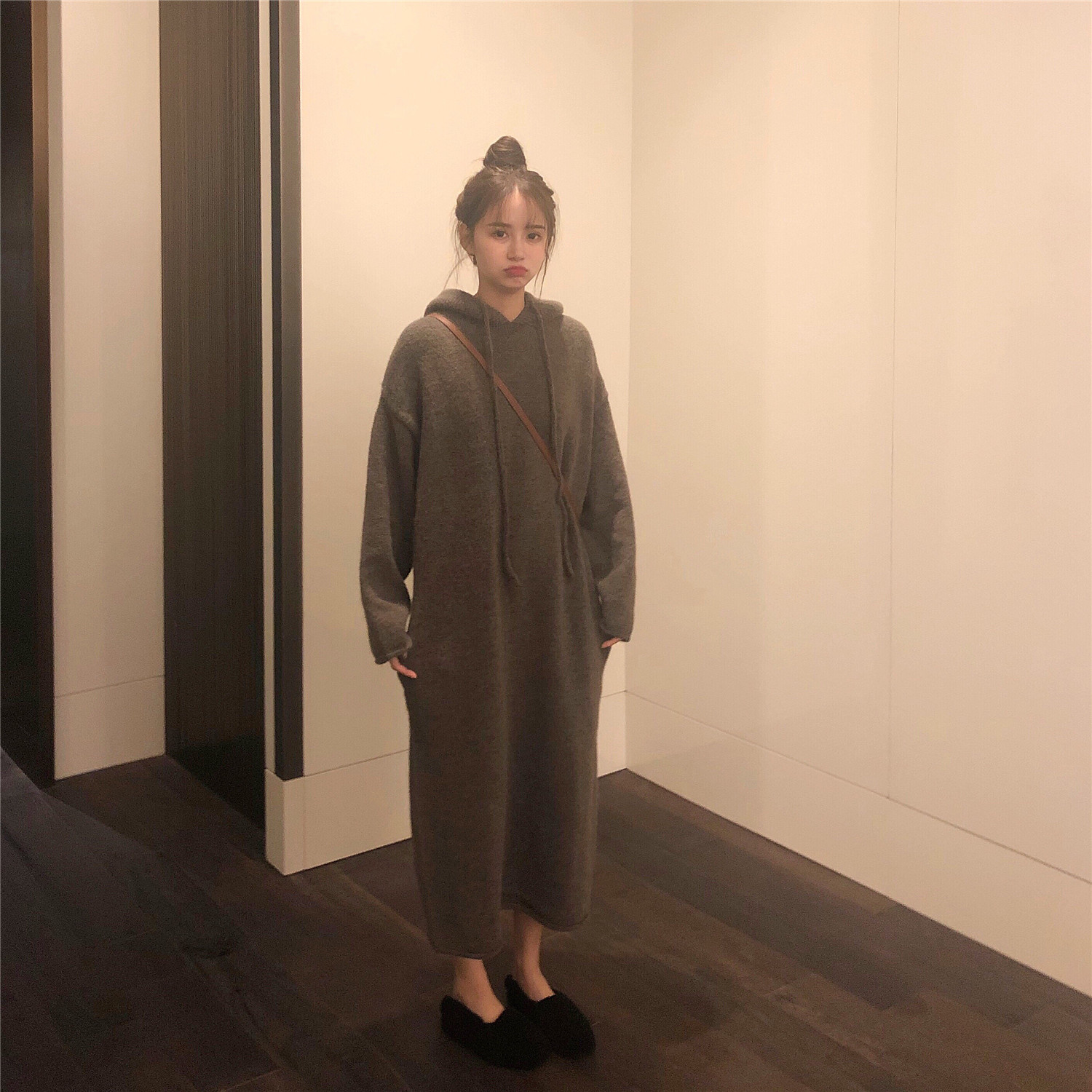 chic早秋裙子長裙女慵懶風韓版百搭寬松連帽系帶過膝長袖連衣裙潮