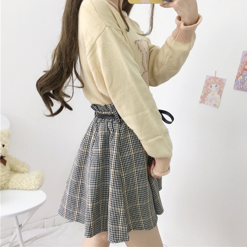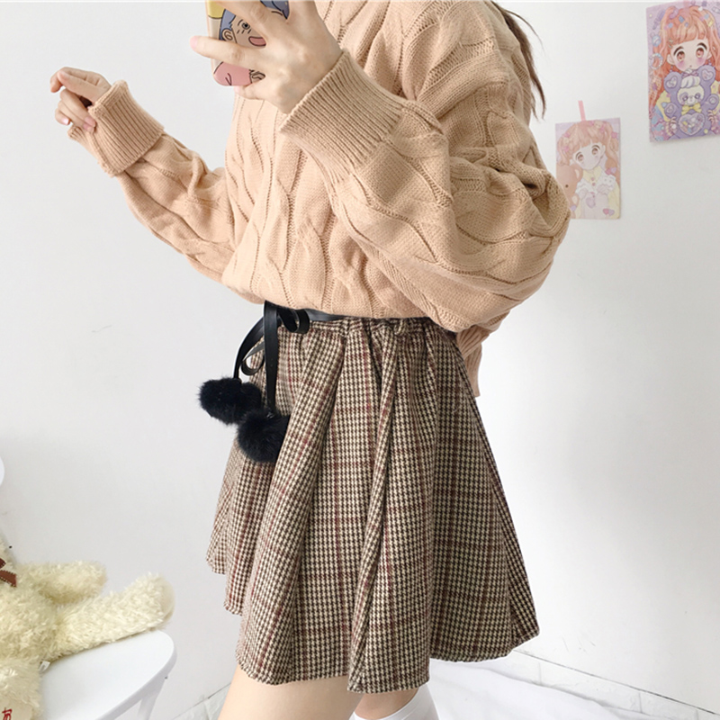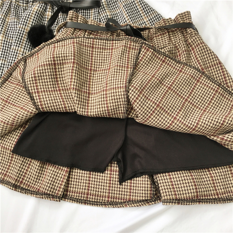 / 毛球系帶高腰顯瘦半身裙甜美少女秋冬裝新款學生復古格子A字短裙