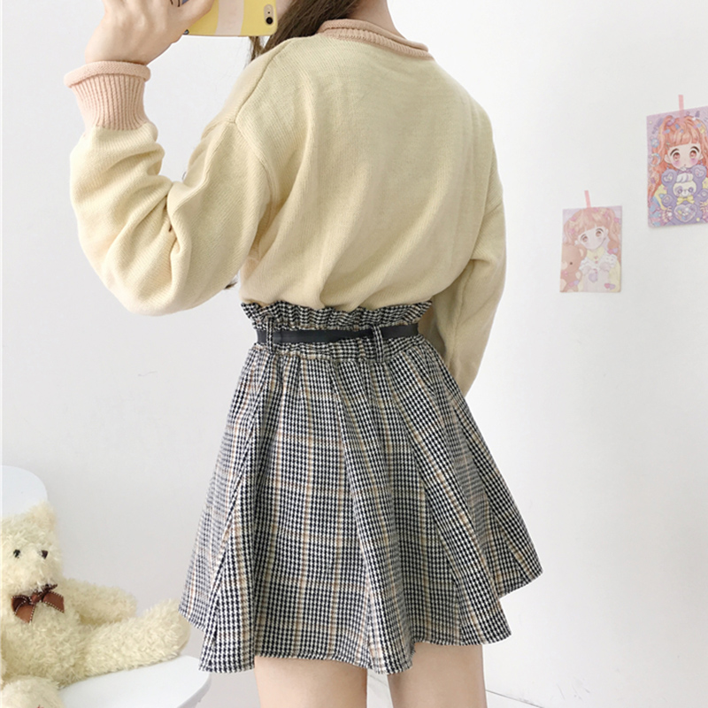 毛球系帶高腰顯瘦半身裙甜美少女秋冬裝新款學生復古格子A字短裙