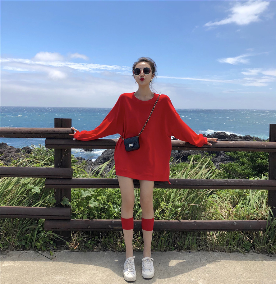 衛衣2018新款女長袖韓版寬松顯瘦oversize印花半高領慵懶長款裙子