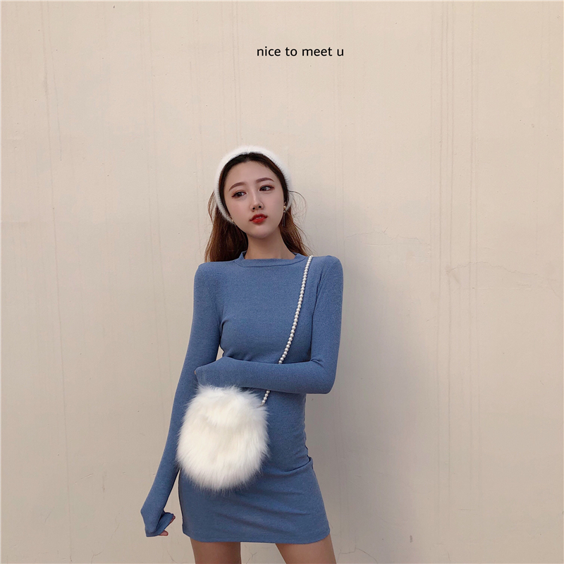 秋裝女2018新款圓領修身顯瘦套頭長袖中長款針織連衣裙包臀打底裙