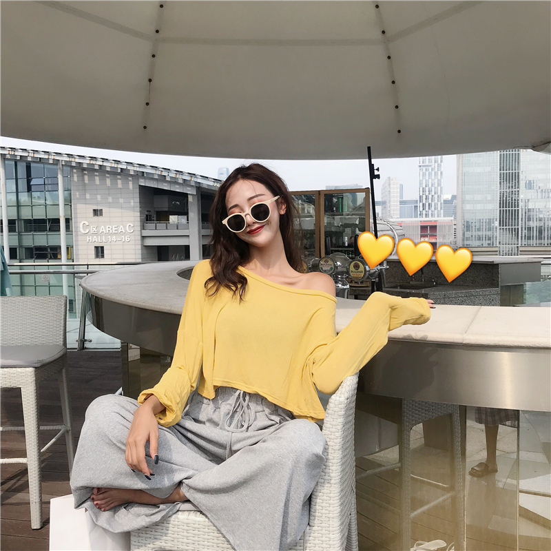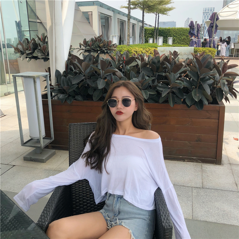 / 新款韓版港風復古chic顯瘦寬松簡約純色百搭防曬長袖上衣短款t恤