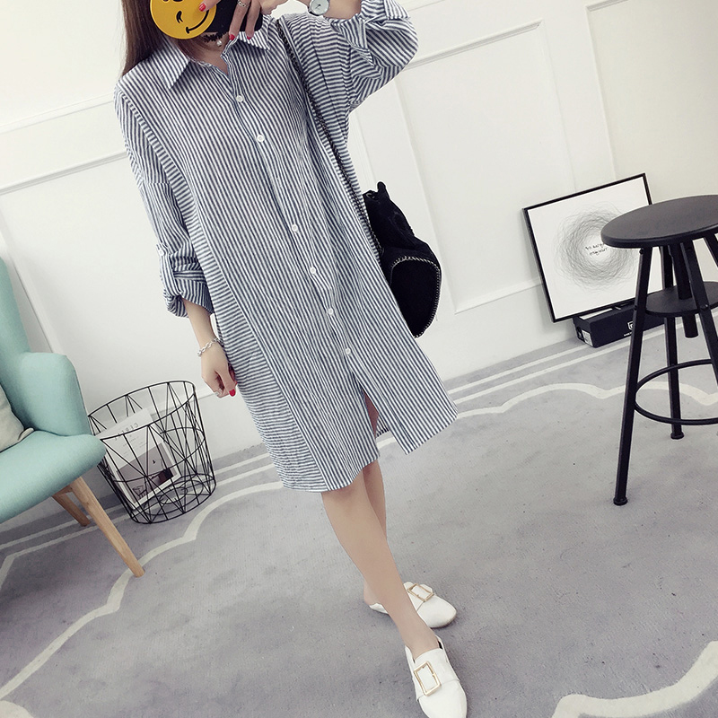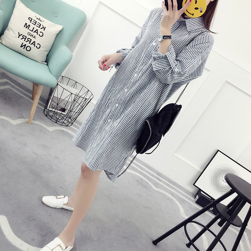 / 豎條紋襯衫女長袖寬松韓版中長款春裝新款百搭學生襯衣學院風
