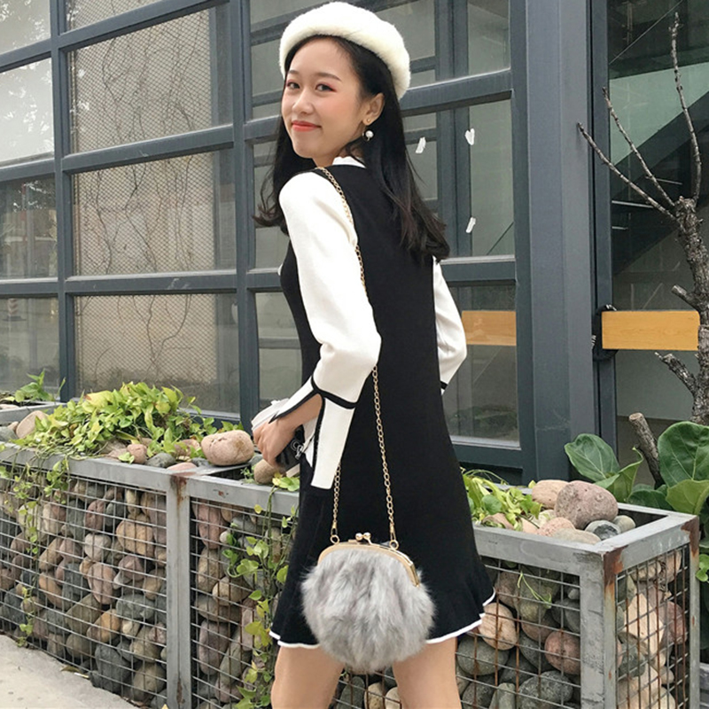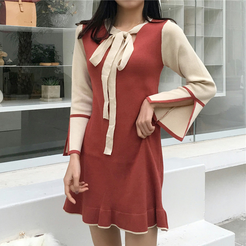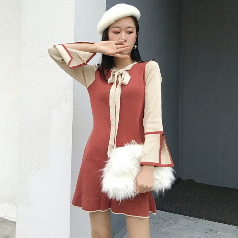 / 法式少女修身顯瘦egg風連衣裙子秋冬裝新款系帶拼色長袖A字桔梗裙