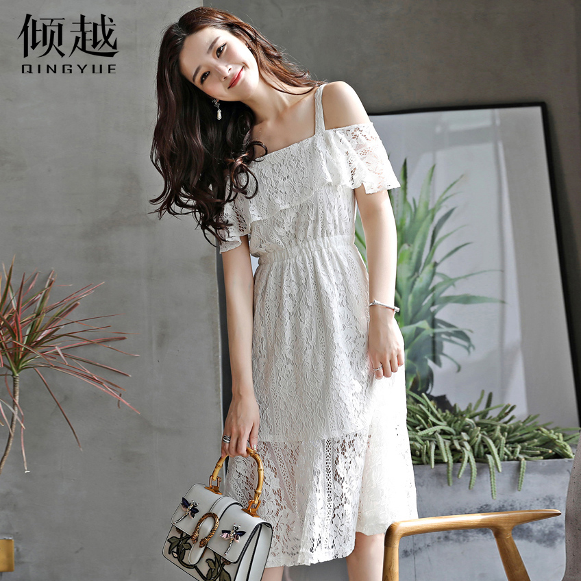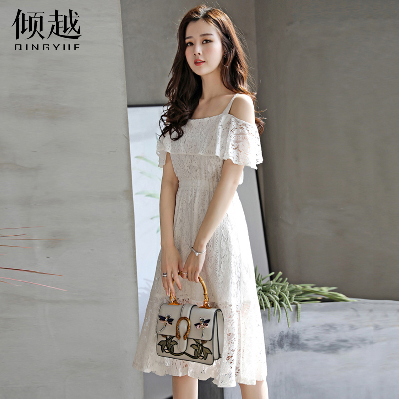 傾越2017夏季露肩吊帶蕾絲連衣裙波西米亞中長款小白裙顯瘦A字裙