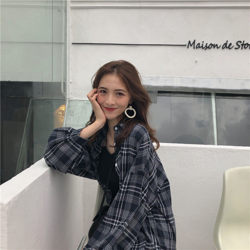 襯衣女2018新款港風顯瘦oversize慵懶寬松格子泡泡袖毛呢襯衫外套