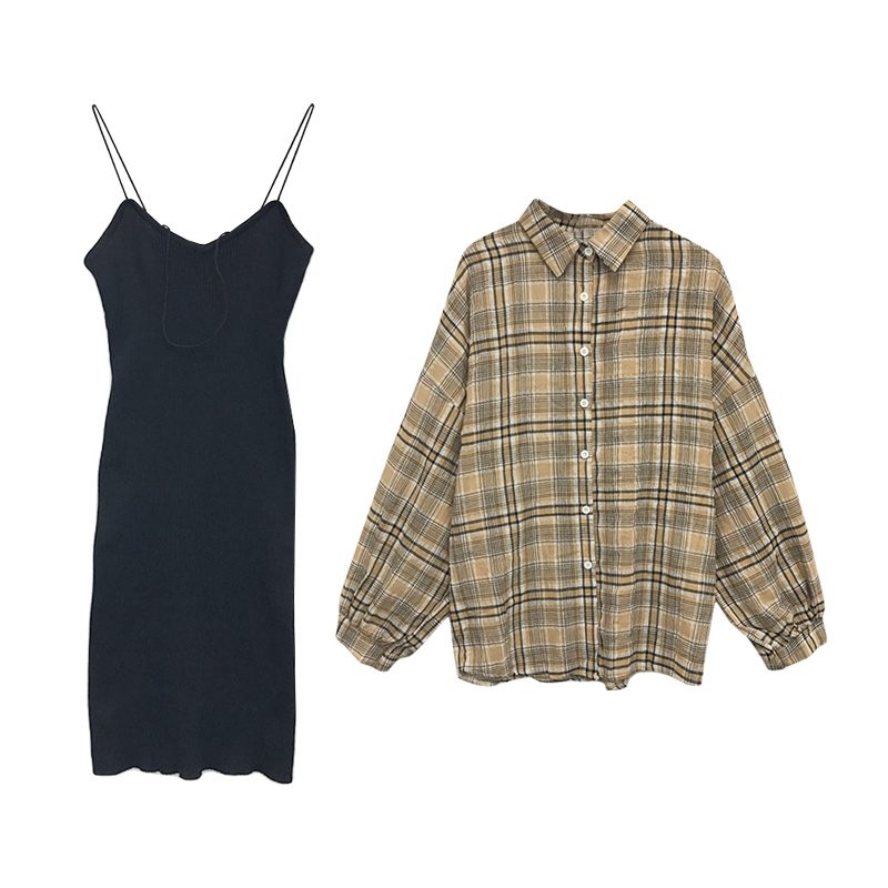 寬松格子長袖防曬襯衫女+掛脖包殿針織吊帶連衣裙時髦套裝分開拍