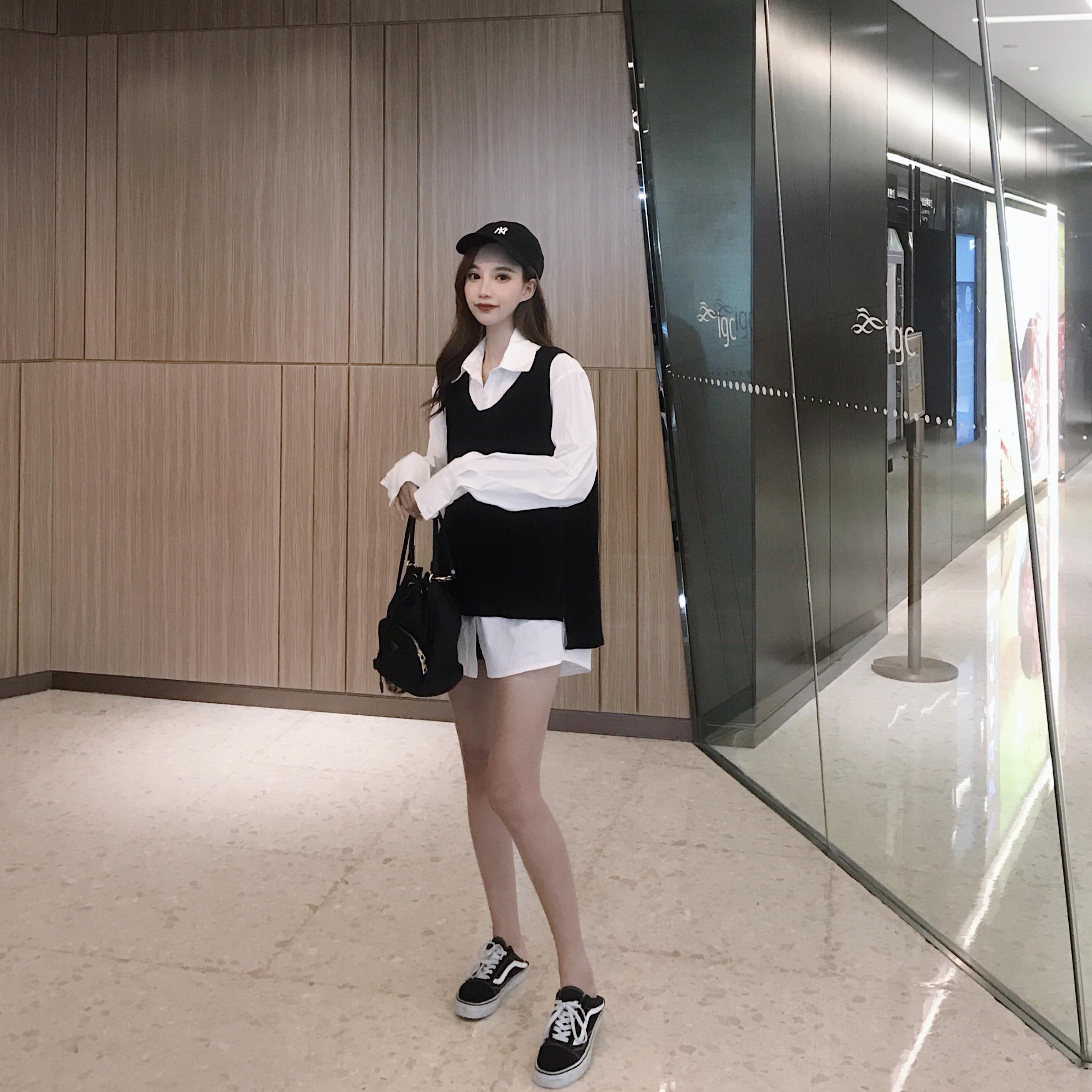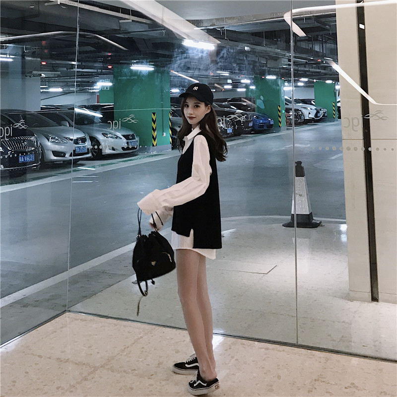 / 秋季新款學院風chic馬甲簡約性感白色長袖襯衫港風時尚套裝兩件套