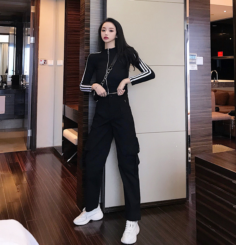 機車寬松直筒闊腿工裝褲時尚套裝長袖黑色顯瘦性感外套女兩件套潮