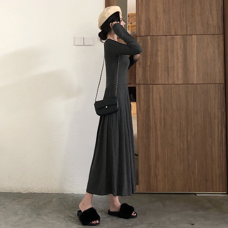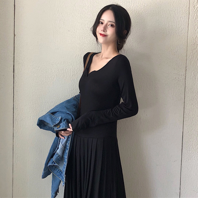 / 法式少女茶歇裙秋黑色修身連衣裙女秋長袖小黑裙百褶中長款打底裙