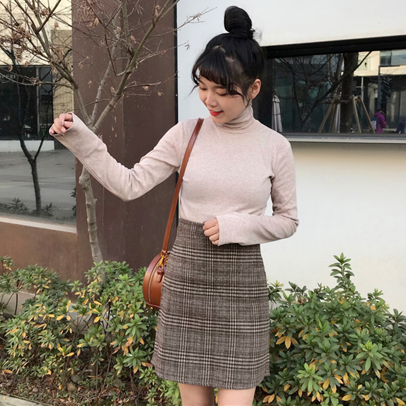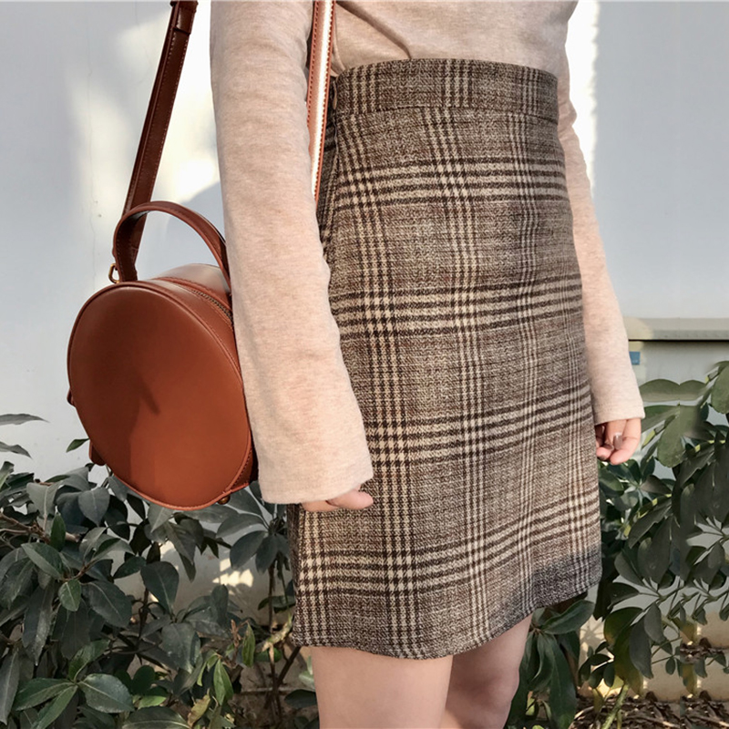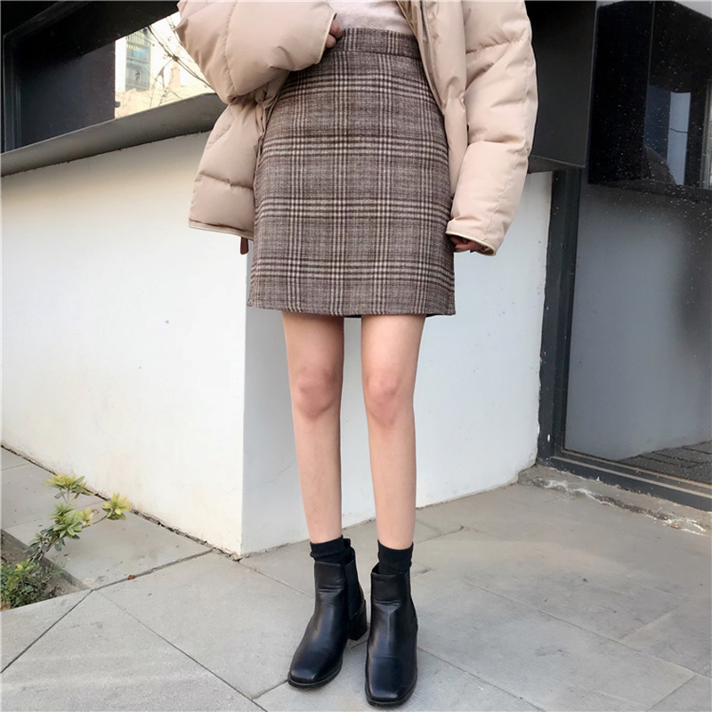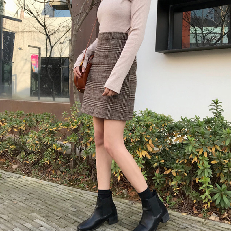 秋裝女2018新款韓版修身顯瘦高腰毛呢格子a字半身裙氣質包臀短裙