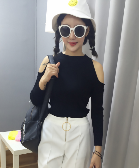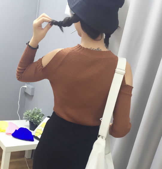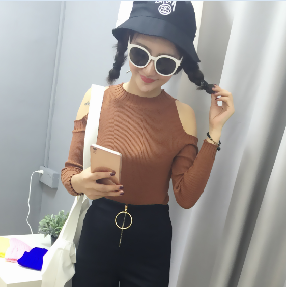 / 秋裝韓版新款修身顯瘦上衣圓領套頭露肩長袖針織衫休閑女裝潮