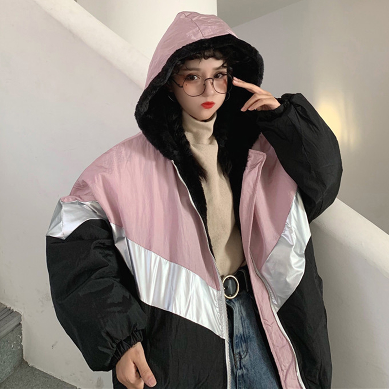 韓版拼色毛領連帽棉襖女2018冬裝新款學生寬松加厚外套時尚棉衣服
